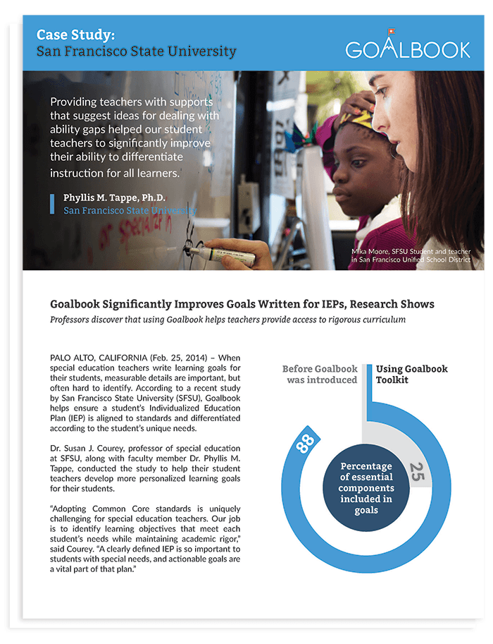 Two professors at San Francisco State University examined IEP goals written by their graduate students, and discovered that they were missing many key elements. They then partnered with Goalbook and provided the resource for their students. Goalbook Toolkit resulted in a significant improvement in crafting IEPs that were personalized, aligned with Common Core State Standards, and more useful in monitoring student progress.